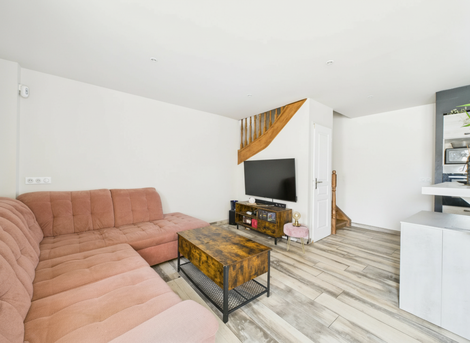Le salon avec cuisine ouverte s’ouvre sur une terrasse, parfaitement à l’abri des regards pour profiter des beaux jours en toute tranquillité.